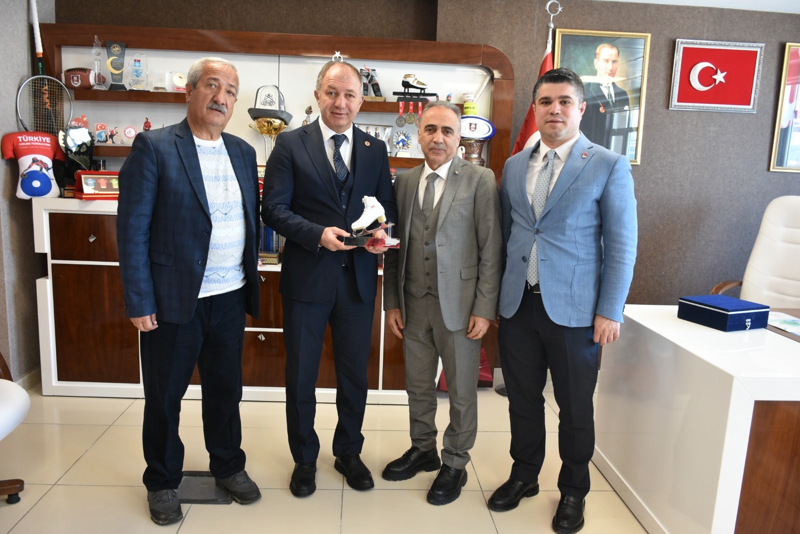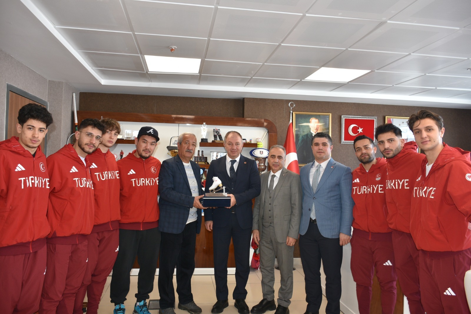 Federasyonumuz Yönetim Kurulu Üyeleri Sayın Ahmet Hamdi IŞIK ve Sayın Naci Korucu; 2022 Kış Olimpiyat Oyunları’nda 6’ncı sırada yer alan, 2023 Avrupa Şampiyonası’nda 3’üncülük elde eden ve 2026 Kış Olimpiyat Oyunları’na katılacak Erzurumlu milli sporcumuz Furkan AKAR ile 2026 Kış Olimpiyat Oyunları’na katılım hakkı kazanan milli sporcumuz Denis Örs, Olimpik Kadro sporcuları ve antrenörlerimizle birlikte Erzurum Gençlik ve Spor İl Müdürü Sayın Levent ÇAKMUR’u ve Erzurum Spor Hizmetleri Müdürü Sayın Erdoğan DÖNMEZ’i makamlarında ziyaret ederek federasyon faaliyetlerine verdikleri katkı ve destekler dolayısıyla plaket takdim etti, nazik ev sahiplikleri ve destekleri için teşekkür etti.